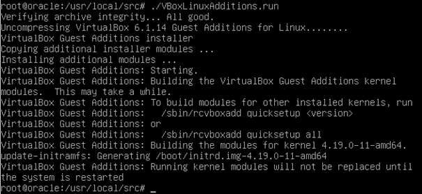 #mount /dev/cdrom /media/cdrom#cp /media/cdrom/VBoxLinuxAdditions.run /usr/local/src#umount /media/cdrom#eject#cd /usr/local/src#./VBoxLinuxAdditions.run