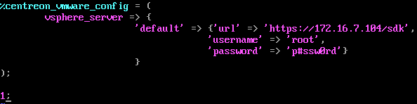 'default'] : adresse IP du serveur ESXi ou de vCenter ; ('default' = nom du container) ;'username'] : compte pour se connecter sur l'hôte ESXi ;'password'] : mot de passe du compte ESXi.Redémarrez le service 'centreon_vmware' :