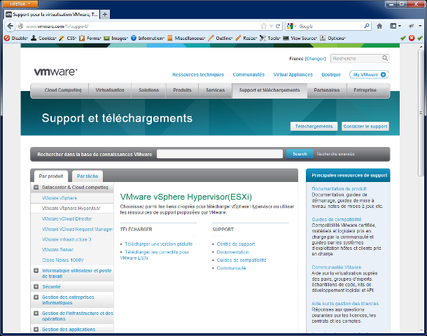 Le site Internet pour le téléchargement de l'hyperviseur est à l'adresse : http://www.vmware.com/fr/support. Un compte est obligatoire pour télécharger les applications de VMware.