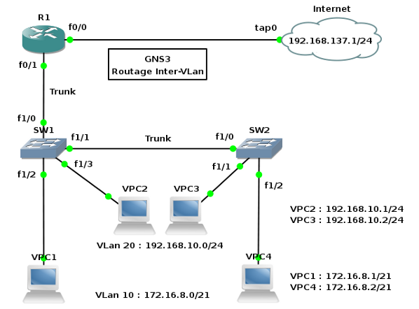 1) Créer la topologie du réseau : routeur, commutateur, VPCs et Cloud ;