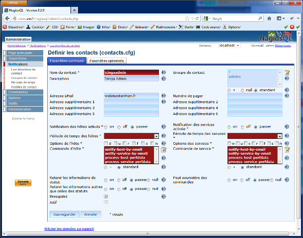 NagiosQL à défini un modèle générique de contact (gabarit) : "generic-contact". Il s'applique par défaut au groupe de contact "admins". Ce modèle peut être dupliqué pour définir des niveaux d'alertes différents suivant l'appartenance d'un groupe.