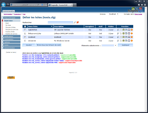 NagiosQL est installé par défaut avec quatre hôtes prédéfinis : hplj2605dn, linksys-srw224p, localhost et winserver. Pour connaître les dépendances avant la désactivation ou la suppression d'un hôte, cliquez sur le bouton "Information" - Icône orange.