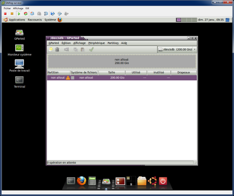 Pour les utilisateurs de VMware ESXi : ajoutez un deuxième disque dur à votre machine vituelle de 200 Go. Lancez vSphere Client. Sélectionnez votre "VM Ubuntu", cliquez sur "Modifier les paramètres", cliquez sur "Ajouter...", sélectionnez "Disque dur", cliquez sur "Suivant", cochez "Créer un disque virtuel", cliquez sur "Suivant", tapez 200 Go pour la taille du disque, validez ensuite les écrans qui suivent. |