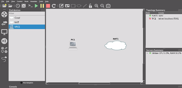 Testez le fonctionnement de GNS3 avec une connexion "NAT Cloud" :